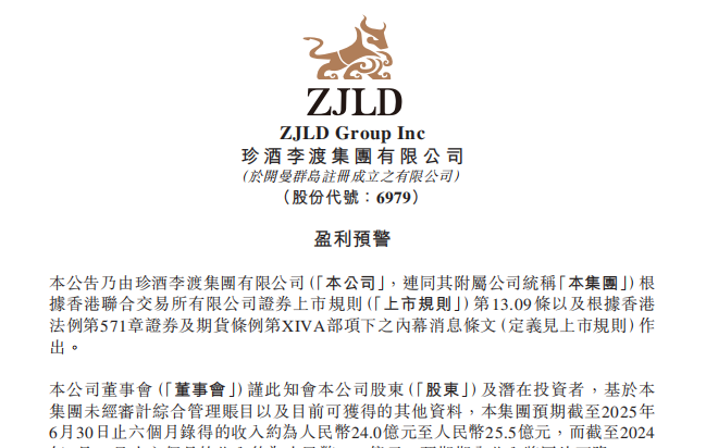 8月5日晚,珍酒李渡(6979.HK)发布业绩预告。预告期内,珍酒李渡预计实现营业收入24亿元—25.5亿元。