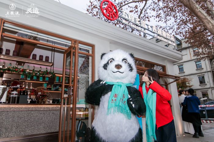 一楼为五粮炙造·西湖潮饮店,门口两个Q版熊猫人偶与市民游客互动,喜迎顾客,开放式操作台与露天吧台,温馨浪漫,专业的调酒师精心调制五粮液新潮饮品,吸引了游客进店打卡品尝。