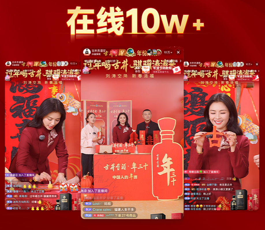 当晚 20:00,古井贡酒抖音官方旗舰店直播间准时拉开帷幕。主持人王小川热力开场后,刘涛身着喜庆穿搭惊艳亮相,直播间热度瞬间攀升,开播5 分钟在线人数便突破 10 万+,弹幕里满是对刘涛的欢迎和对年酒的期待。“过年喝古井” 的关键词持续刷屏,热闹得如同一场线上新春派对。